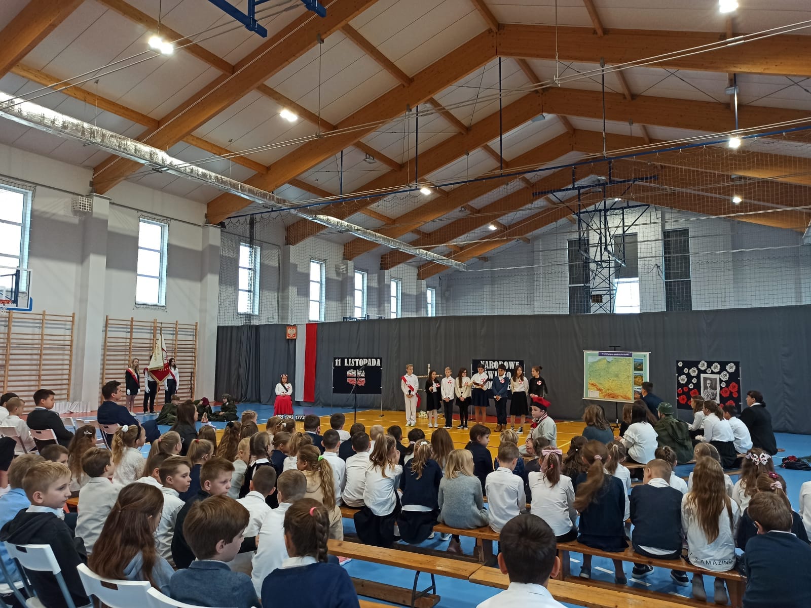 Nastrojowy montaż słowny – muzyczny wprowadził zebranych uczniów i nauczycieli w poważny, patriotyczny nastrój. Pan dyrektor – Marek Kossoń przypomniał, na czym współcześnie polega postawa umiłowania ojczyzny szczególnie przez dzieci i młodzież, a także zaprosił do udziału w gminnych obchodach Narodowego Święta Niepodległości.