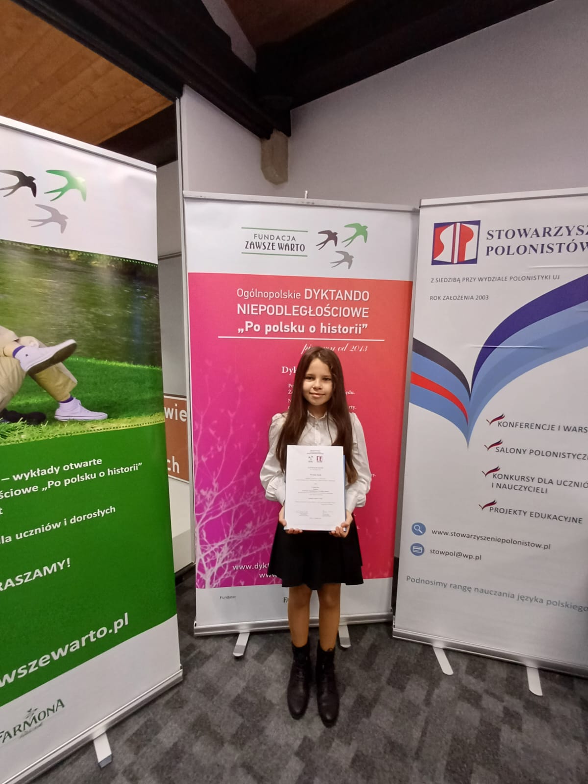 21 listopada uczennica kl. Va – Weronika Pawlik wzięła udział w uroczystej gali wręczenia nagród i dyplomów XI Dyktanda Niepodległościowego „Po polsku o historii”, która odbyła się w Muzeum Inżynierii Miejskiej w Krakowie.