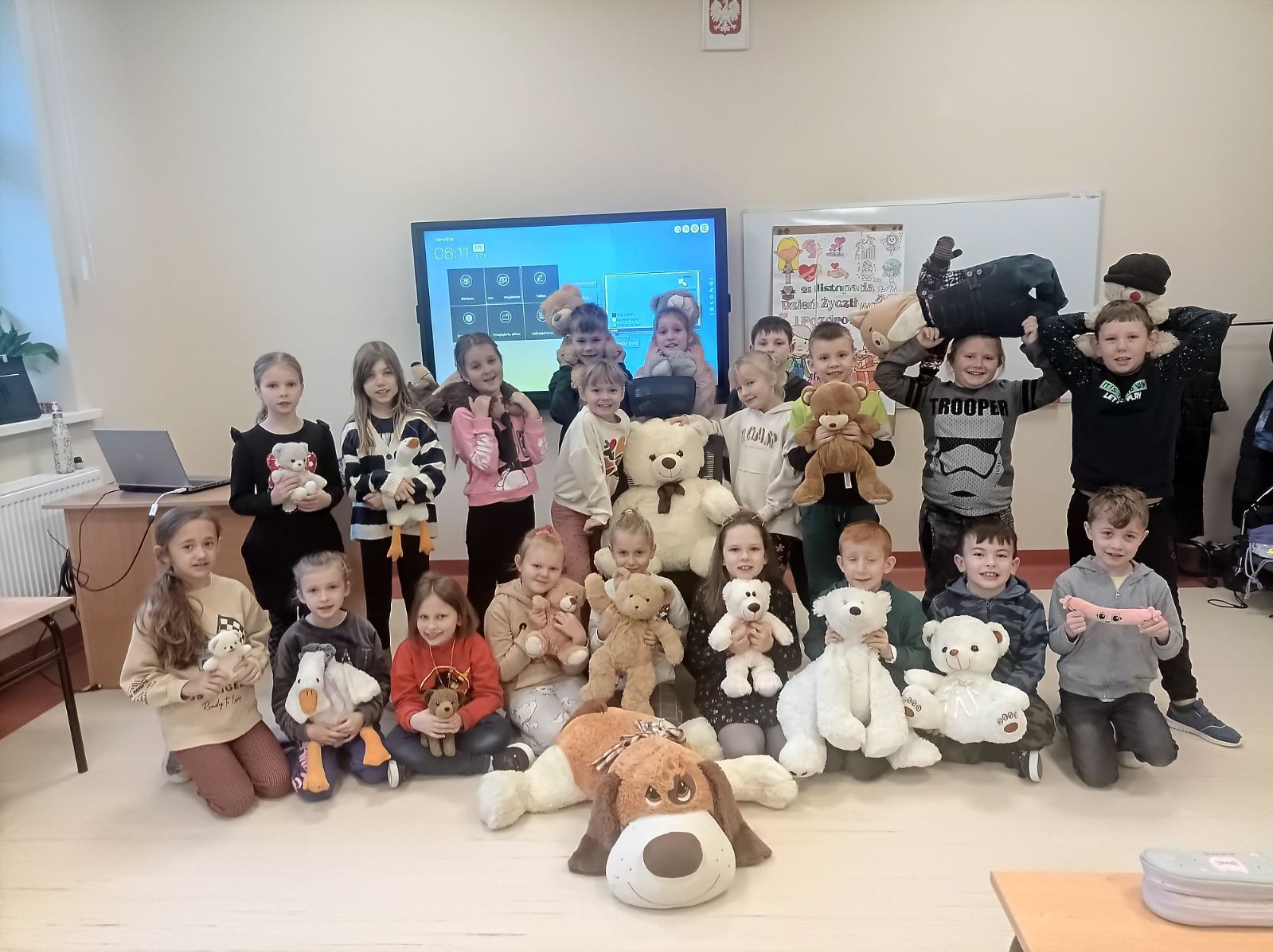 W 24 listopada w przeddzień Światowego Dnia Pluszowego Misia klasy 1-3 obchodziły to święto. Tego dnia dzieci przyszły do szkoły ze swoimi maskotkami. Przybyły misie małe, średnie i bardzo duże, białe, brązowe i kolorowe. Każdy był piękny i wyjątkowy. Dzieci poznały historię święta, wysłuchały wierszy i piosenek o misiach. Pluszaki towarzyszyły dzieciom podczas nauki, zabaw ruchowych, zajęć plastycznych, a nawet podczas ćwiczeń gimnastycznych. Ten dzień był pełen radości, uśmiechu i wspólnej zabawy. To misiowe święto zostanie w naszych wspomnieniach na długi czas.