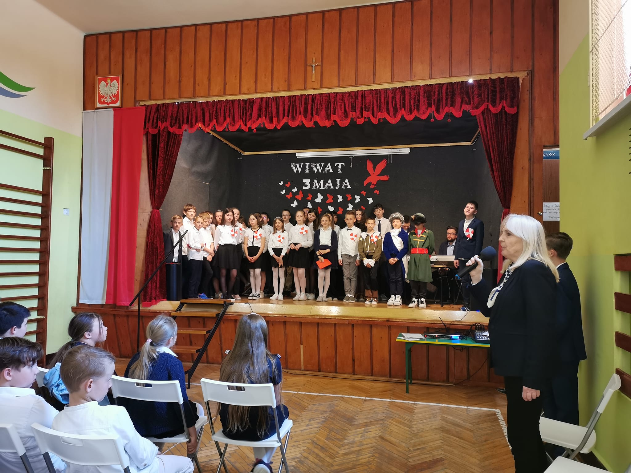 Uczniowie klas 4b i 7 zaprezentowali program artystyczny, którym przedstawili cenną lekcję historii. Miała na celu przybliżyć tamte wzniosłe wydarzenia związane z uchwaleniem pierwszej w Europie a drugiej na świecie konstytucji. W ten sposób uczniowie wzbogacili wiedzę historyczną młodszych i starszych kolegów i koleżanek o tym patriotycznym wydarzeniu.