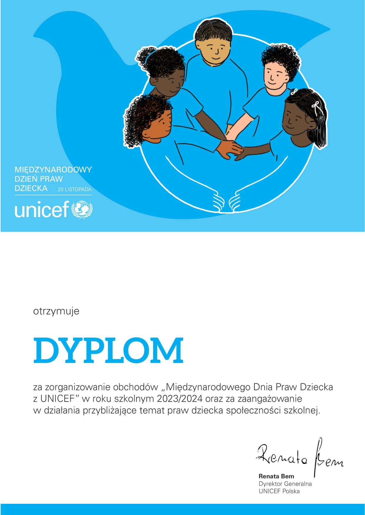 Dyplom za zorganizowanie obchodów "Międzynarodowego Dnia Praw Dziecka z UNICEF" Author Anna CATEGORY aktualności - blog