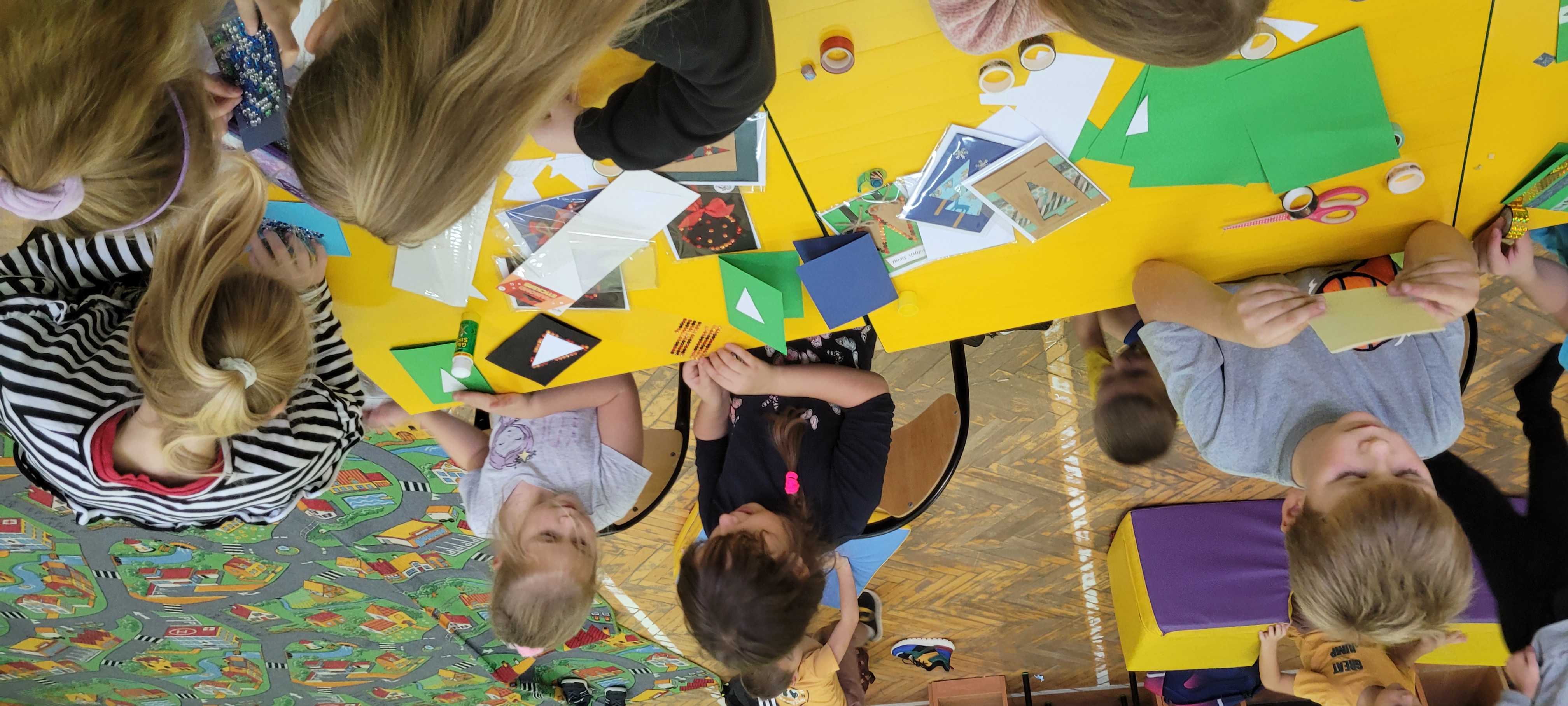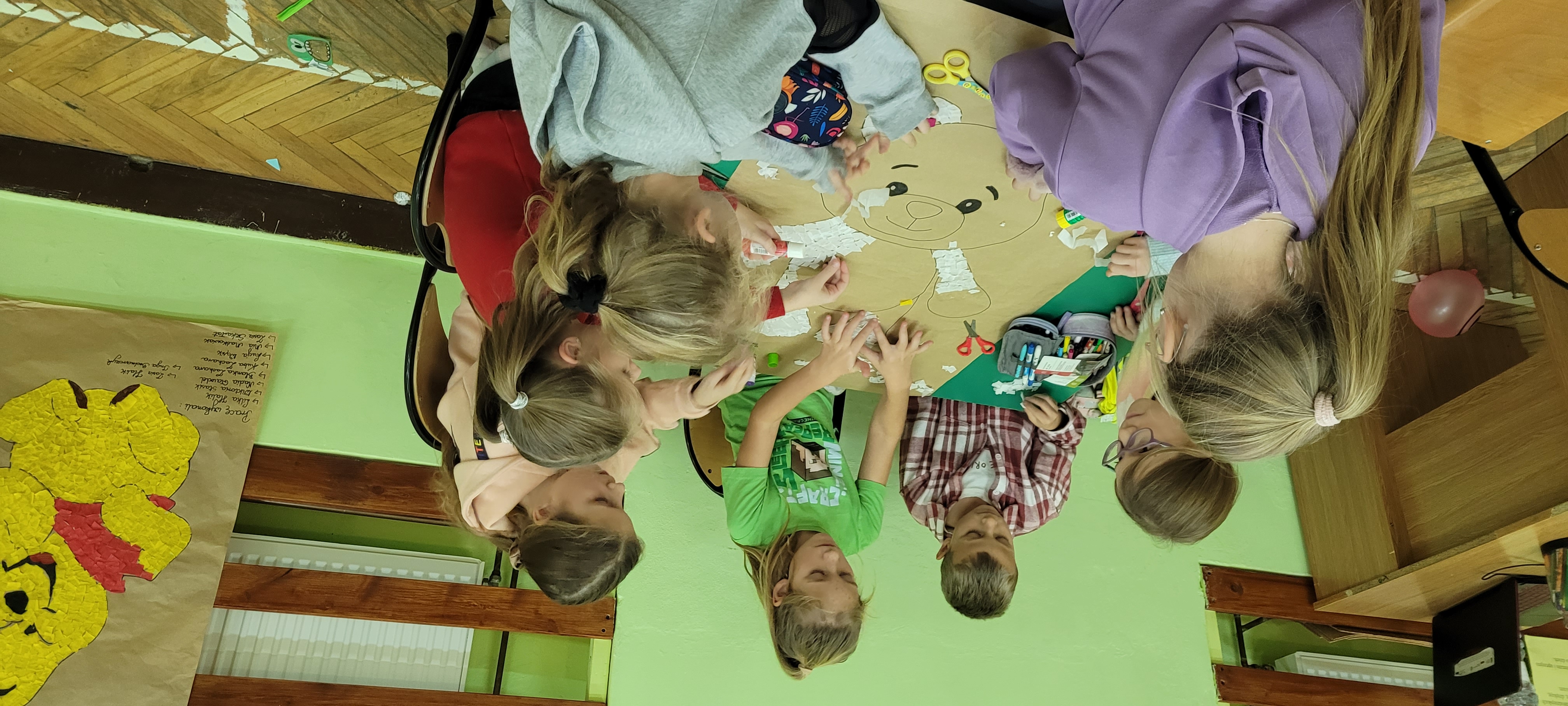 Dzieci wykonały różnorodne prace plastyczne przedstawiające niedźwiadki. Wykorzystano technikę wyklejania, malowania i rysowania. Na zakończenie zajęć pięknymi pracami udekorowano salę.